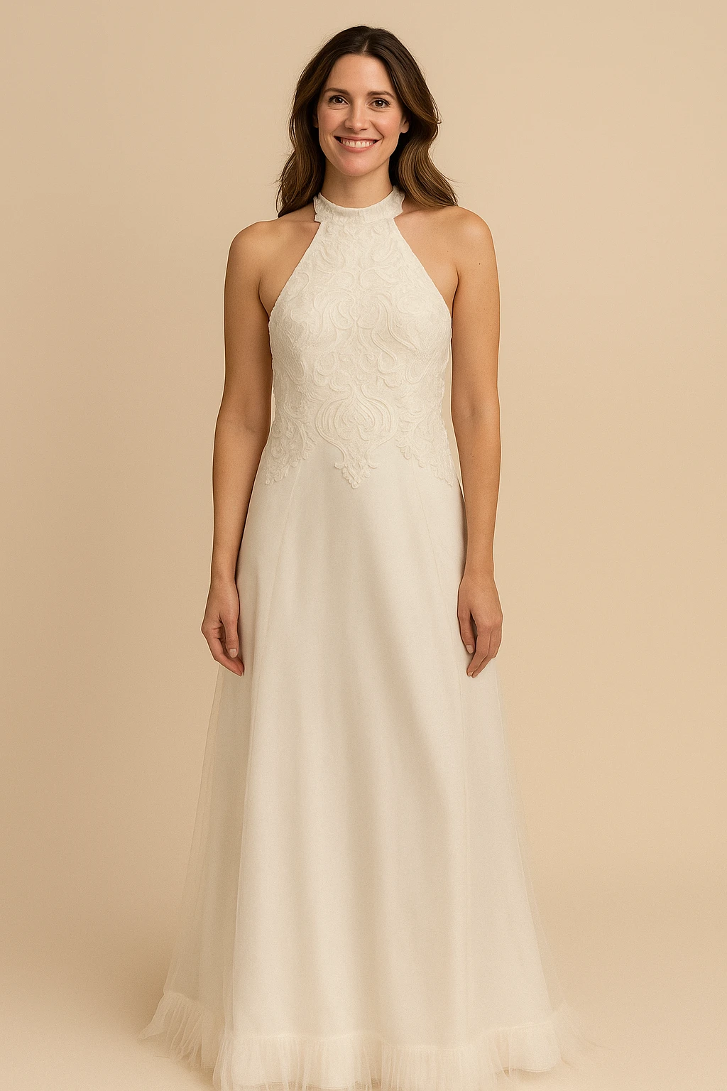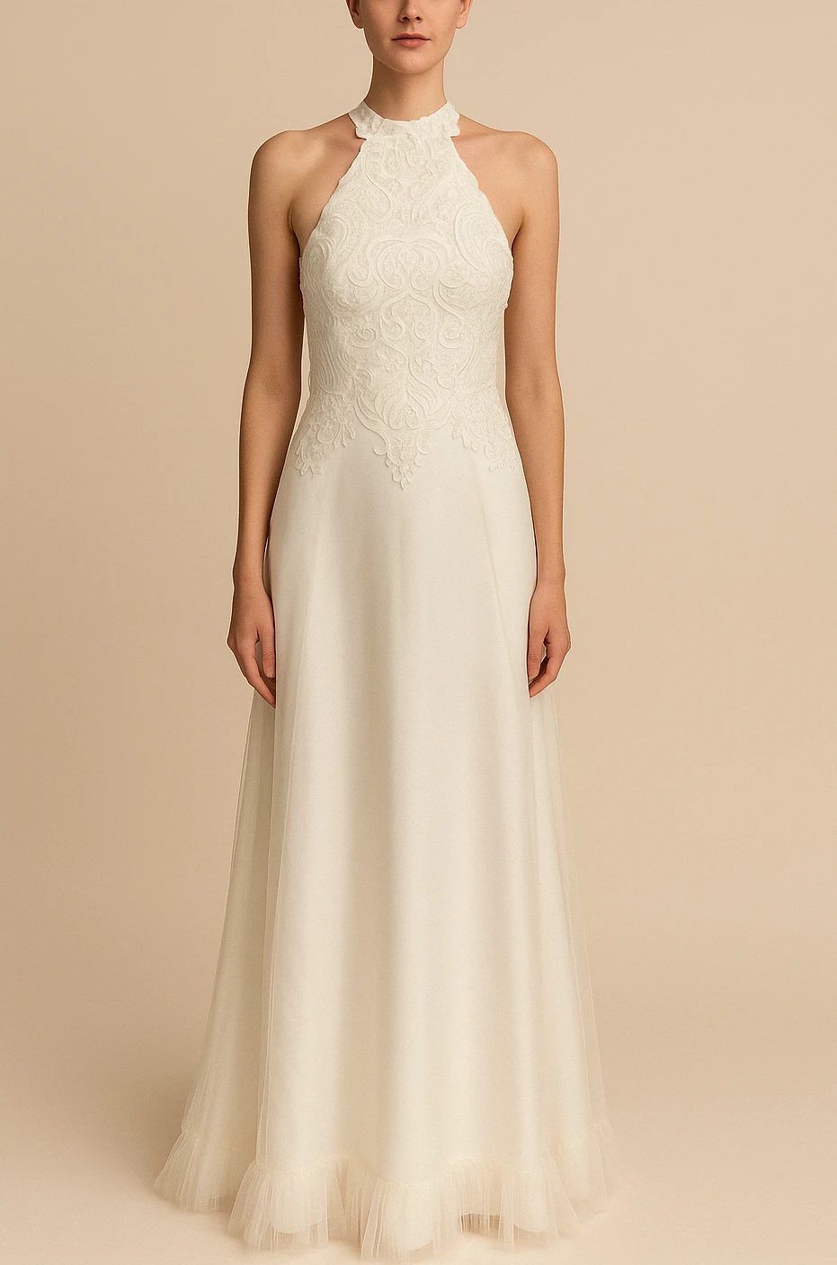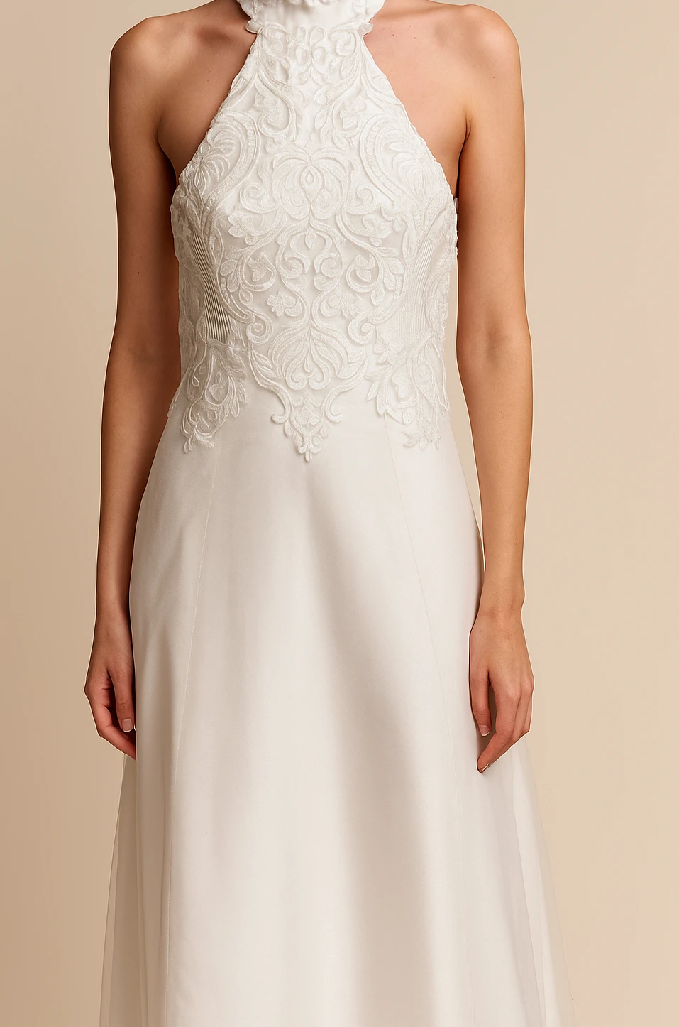 El vestido Apolo se distingue por su escote halter que enmarca el rostro y hombros con elegancia. El corpiño, trabajado en un bordado de motivos orgánicos en relieve, se funde de manera armónica con la falda, generando continuidad y estilizando la silueta.