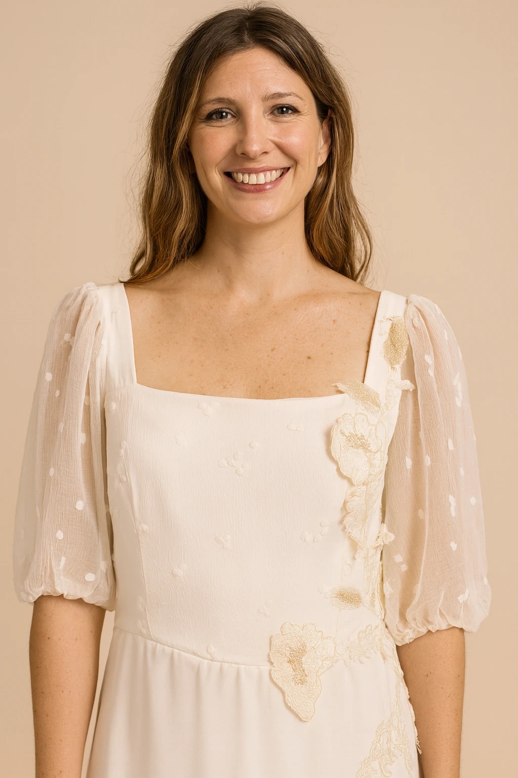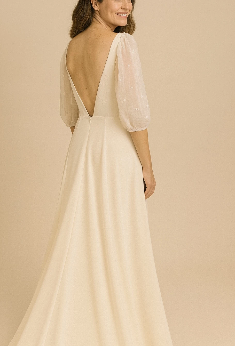 El corpiño es recto, con breteles anchos y espalda en V, aportando equilibrio entre sobriedad y sensualidad. Confeccionado en gasa de seda natural, se distingue por los delicados lunares bordados en hilo al tono, que aportan textura y sofisticación.