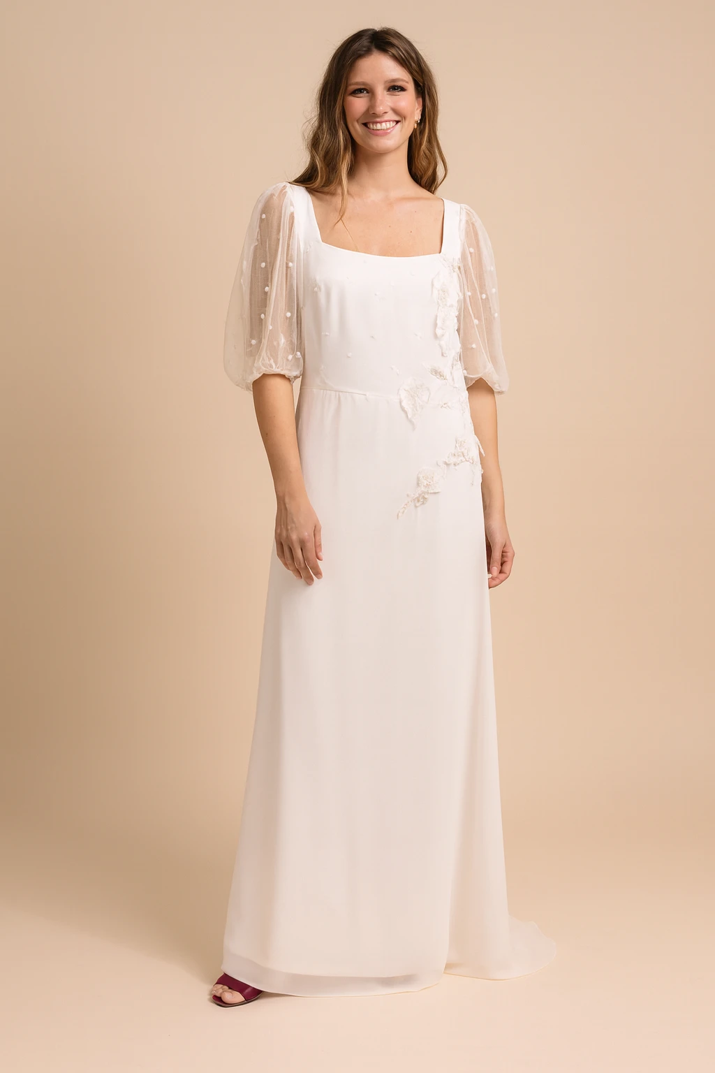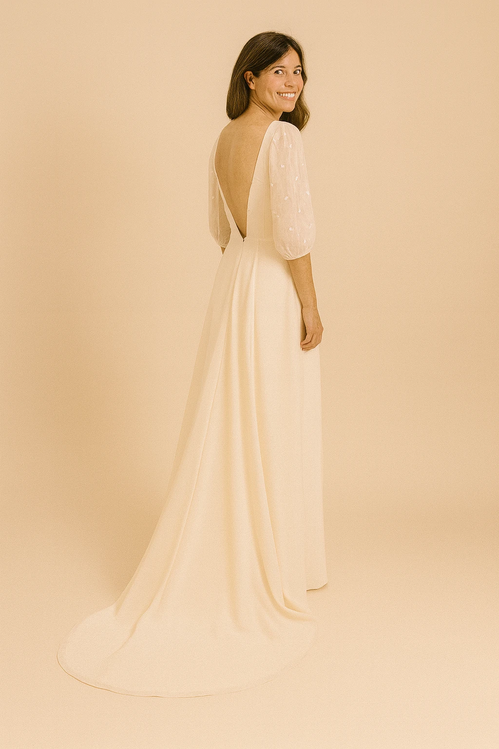 La falda base en crepe por encima gasa , con caída ligera y cola sutil, realza la fluidez del diseño. Las mangas, confeccionadas en el mismo textil que el corpiño, son desmontables, permitiendo alternar entre una versión más romántica o la pureza del vestido con breteles anchos.
