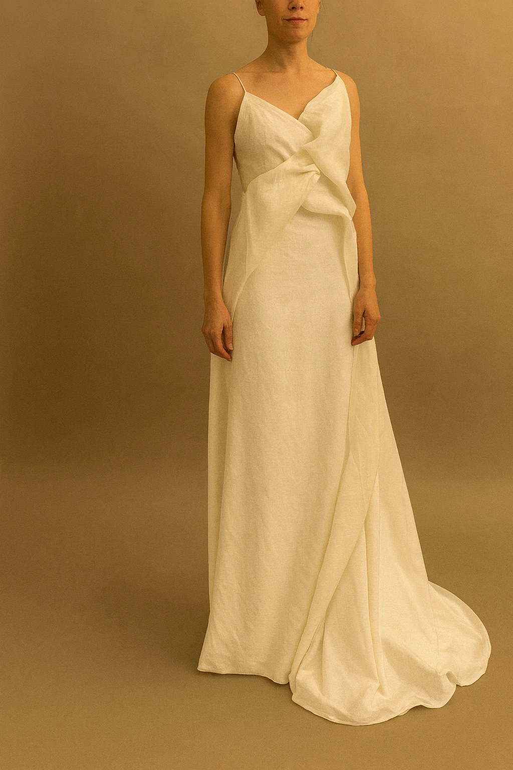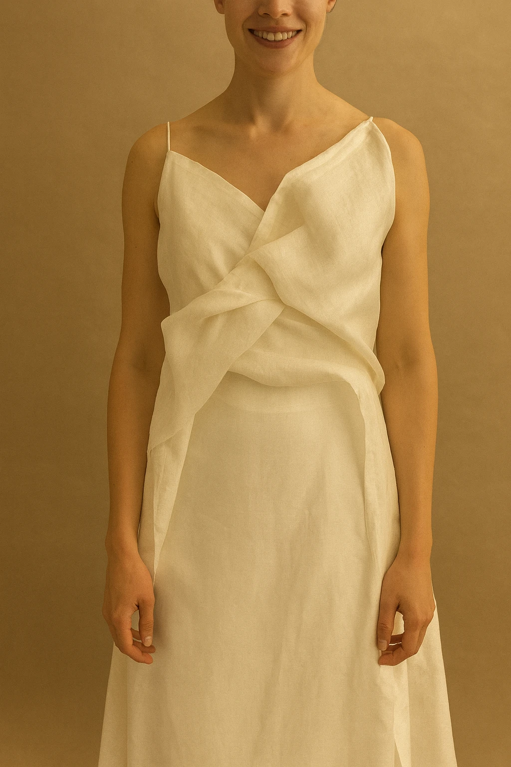 Está confeccionado en un textil especial de doble capa, compuesto por una base de organza de seda natural y algodón, unidas delicadamente a través de puntadas dispersas cosidas a mano. Este detalle minucioso transforma la tela en un lienzo con textura propia, aportando un carácter exclusivo y artístico a la prenda.