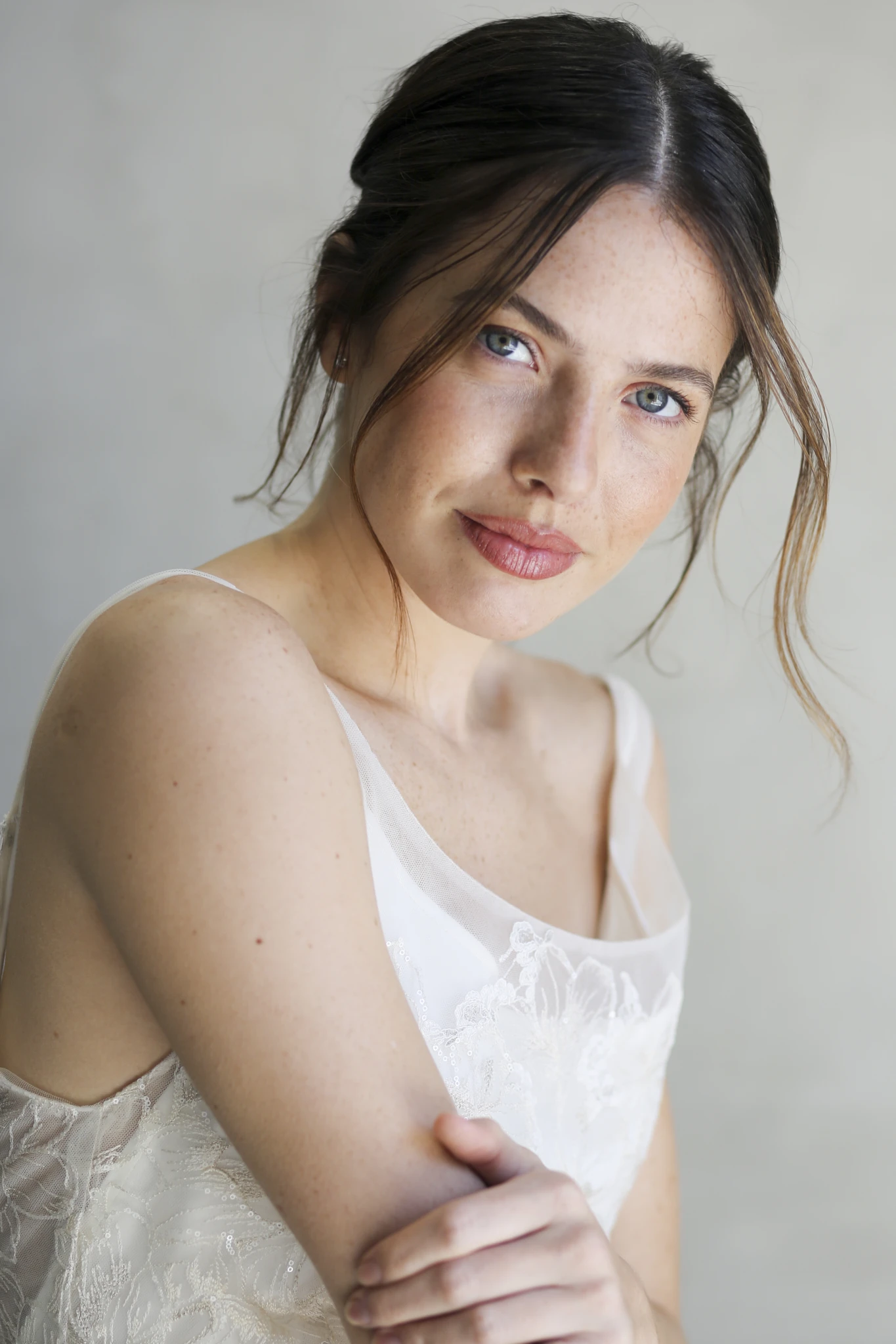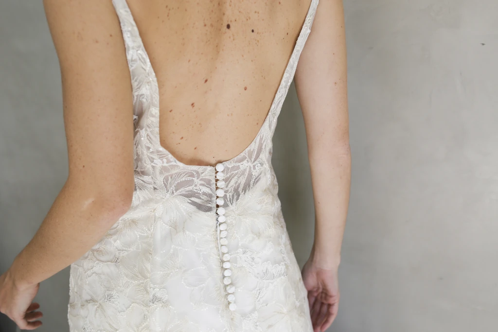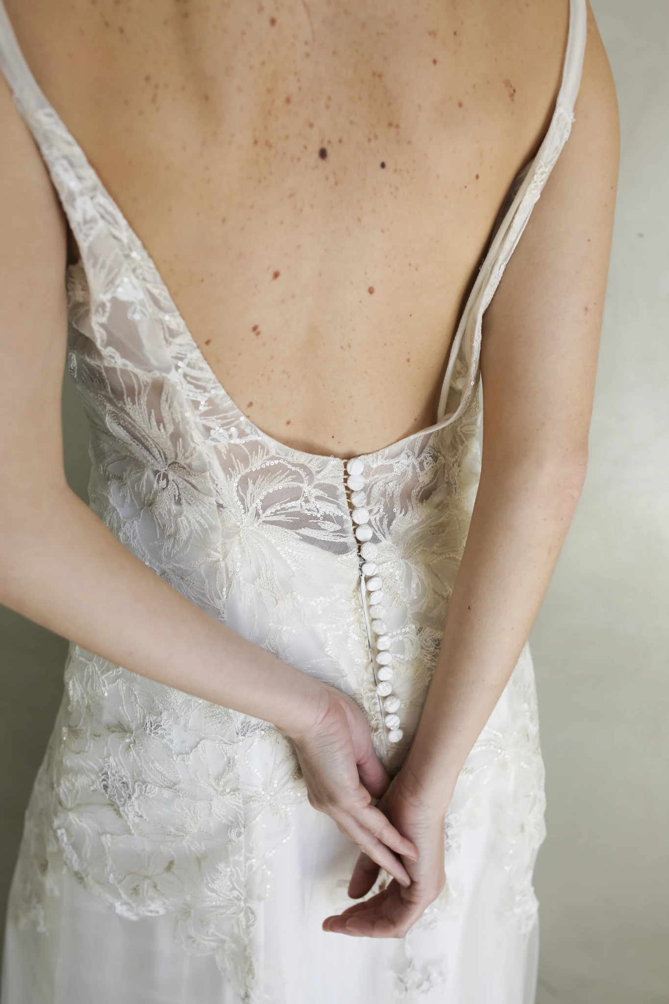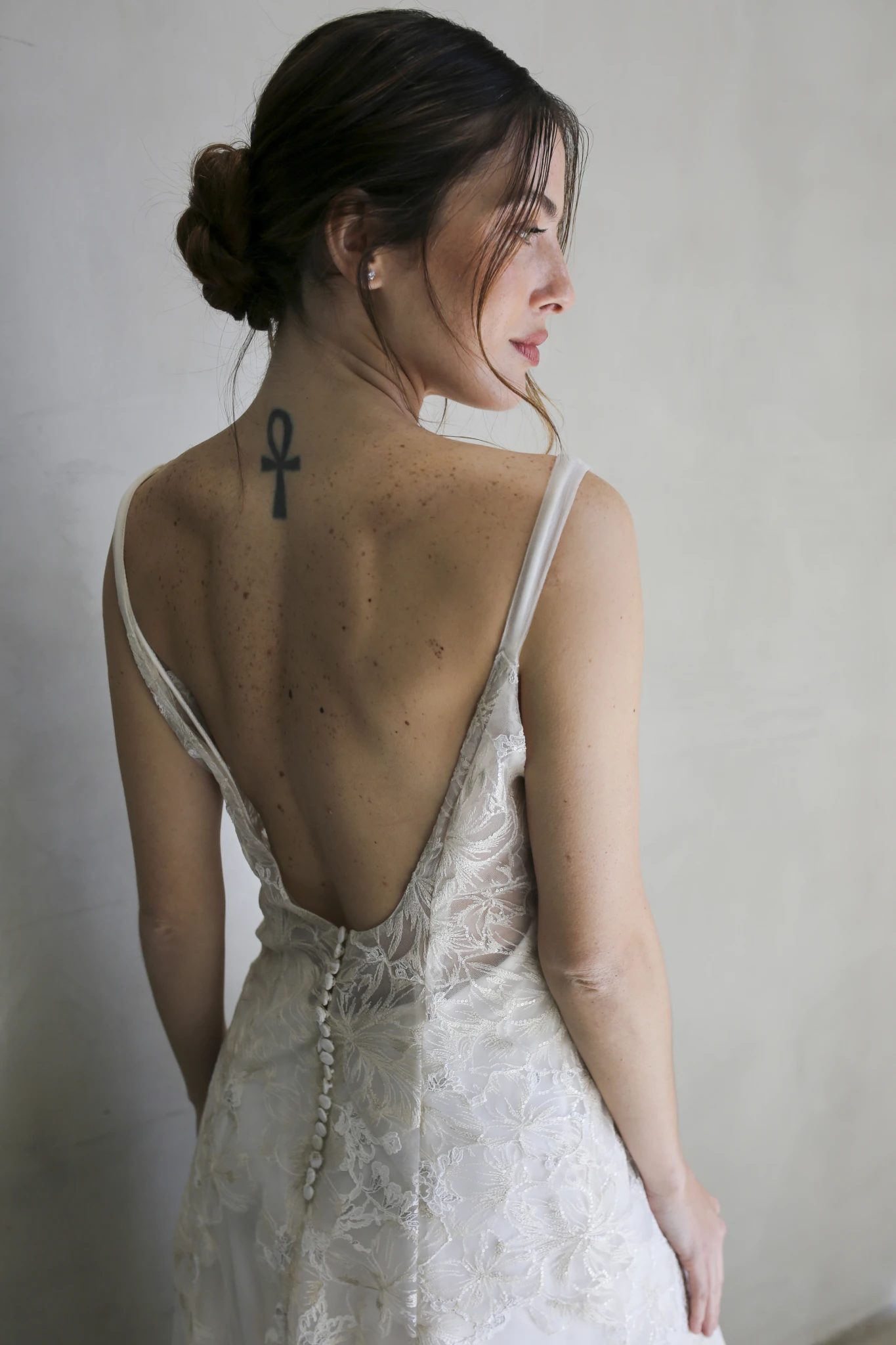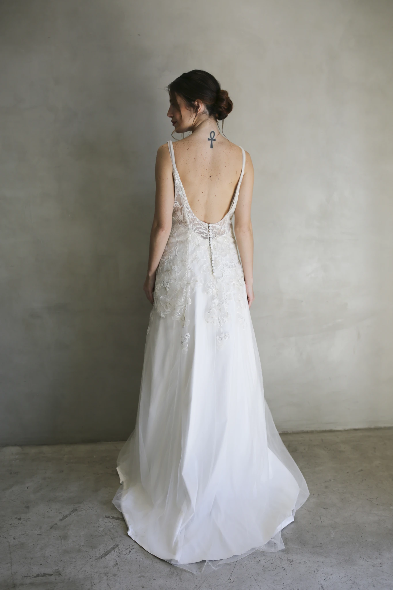 La espalda profunda, terminada en una hilera de botones forrados, aporta un gesto clásico y artesanal, realzando la delicadeza de la pieza. Confeccionada en capas ligeras de tul, cae con naturalidad y se prolonga en una cola fluida, otorgando movimiento y romanticismo.