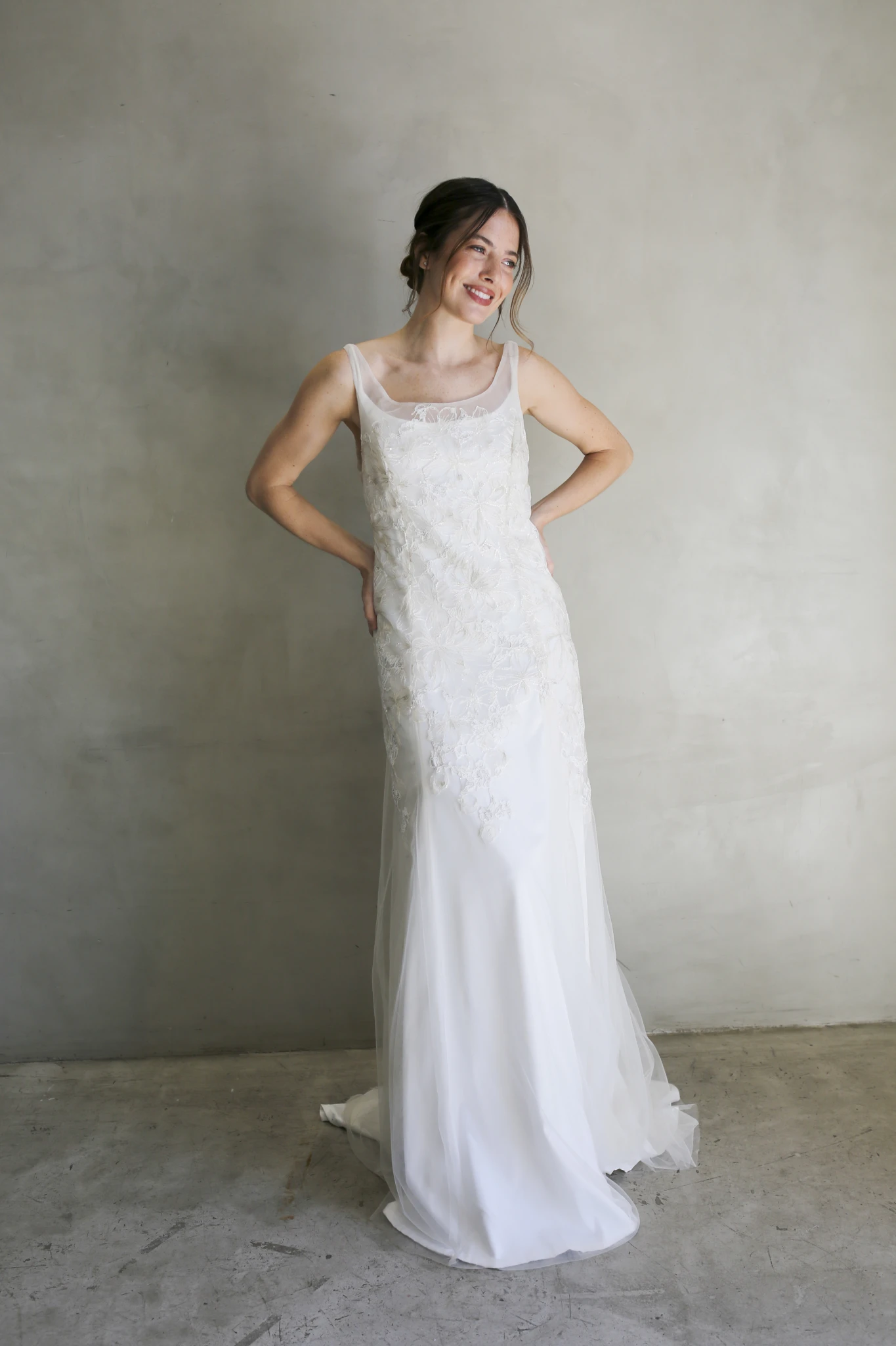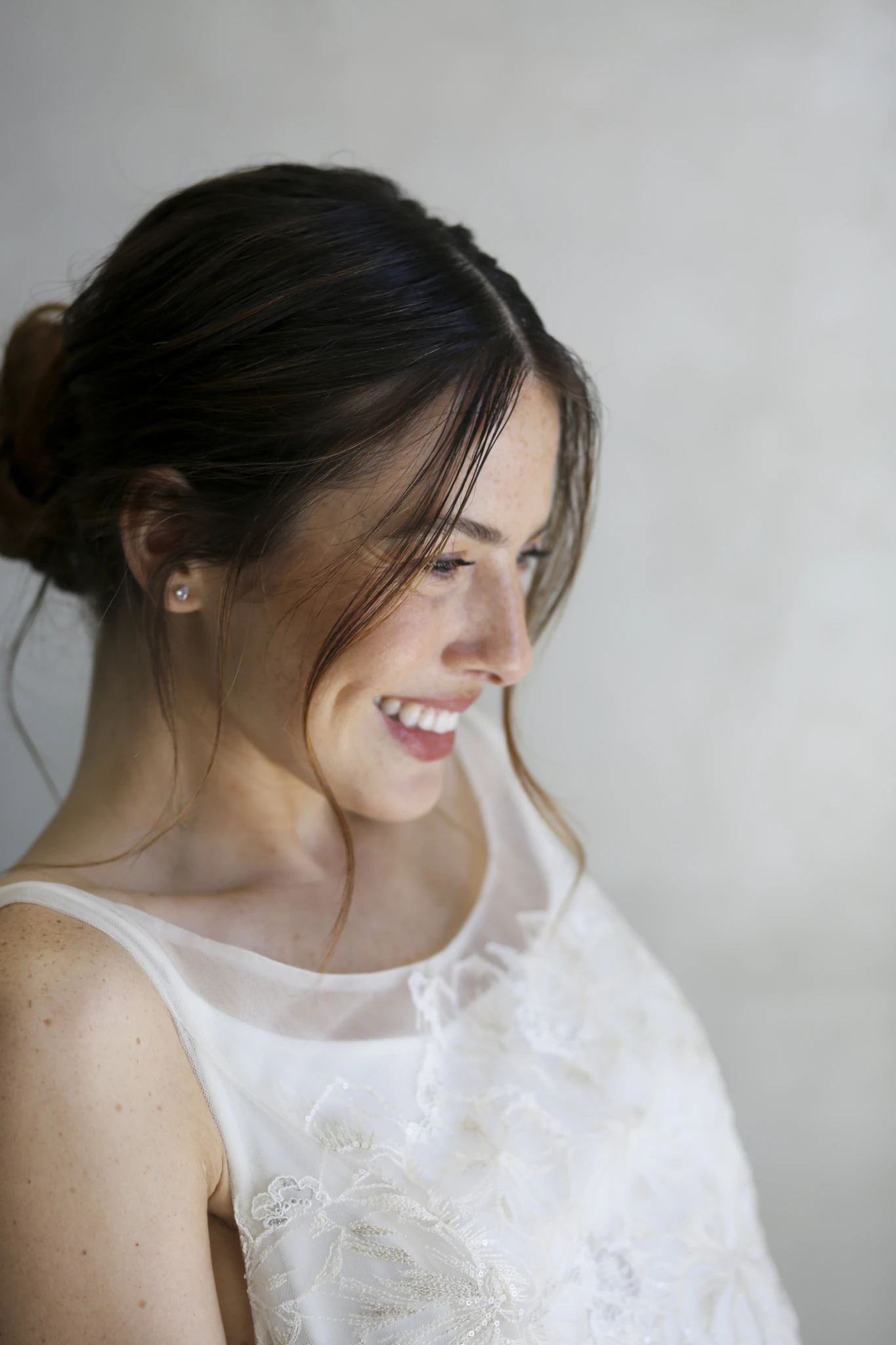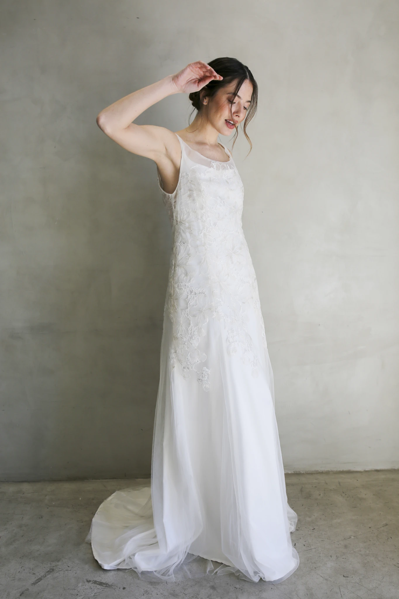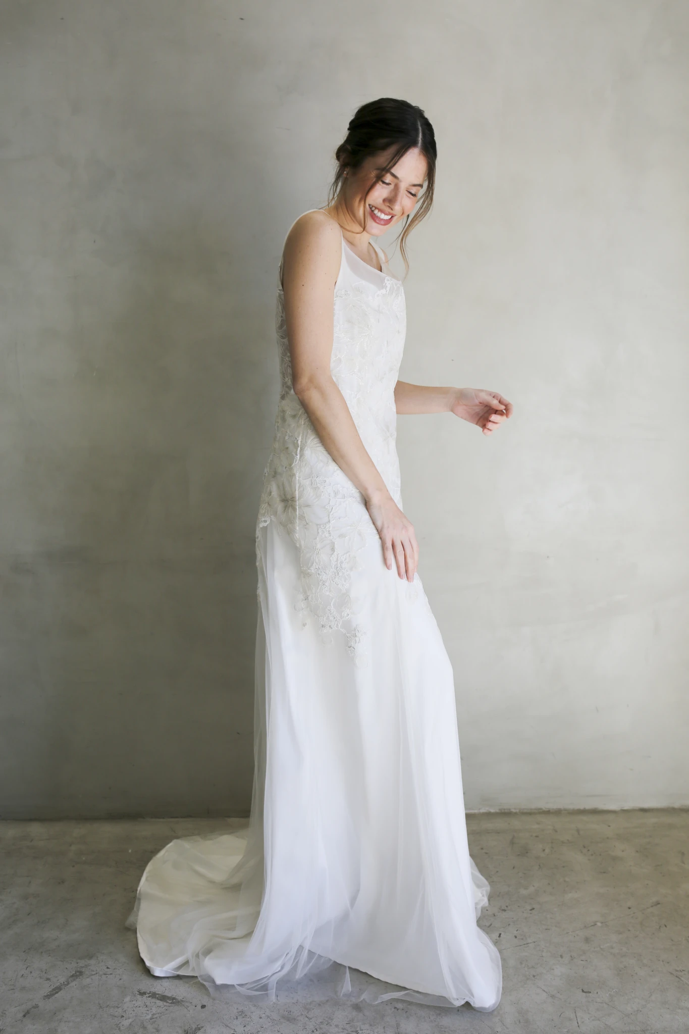 La espalda profunda, terminada en una hilera de botones forrados, aporta un gesto clásico y artesanal, realzando la delicadeza de la pieza. Confeccionada en capas ligeras de tul, cae con naturalidad y se prolonga en una cola fluida, otorgando movimiento y romanticismo.