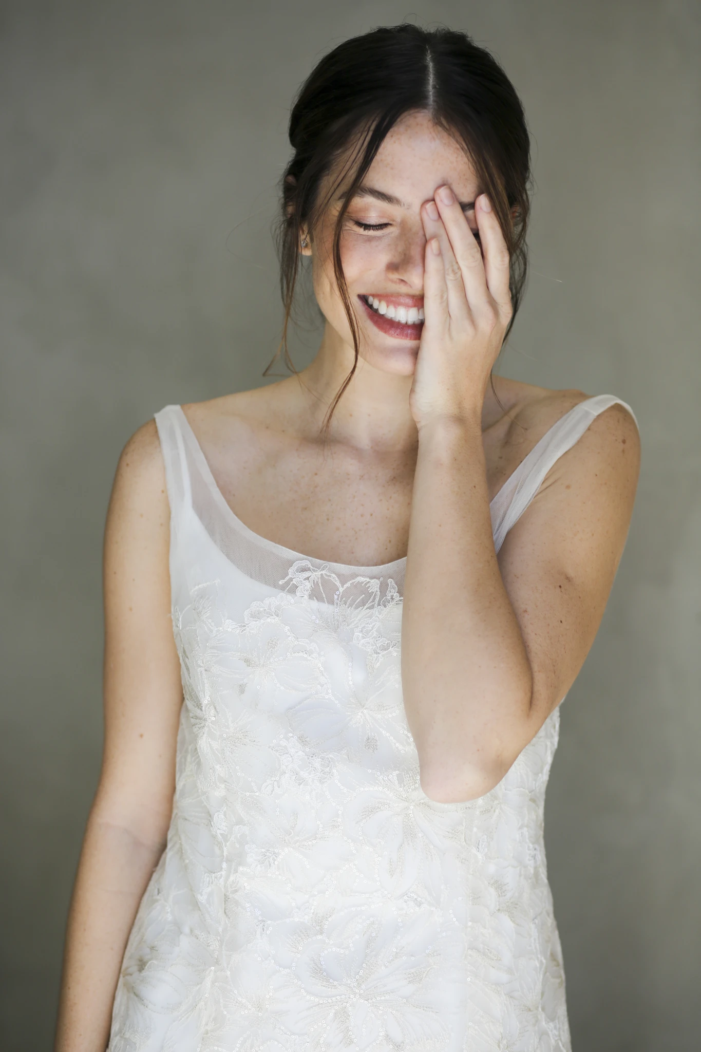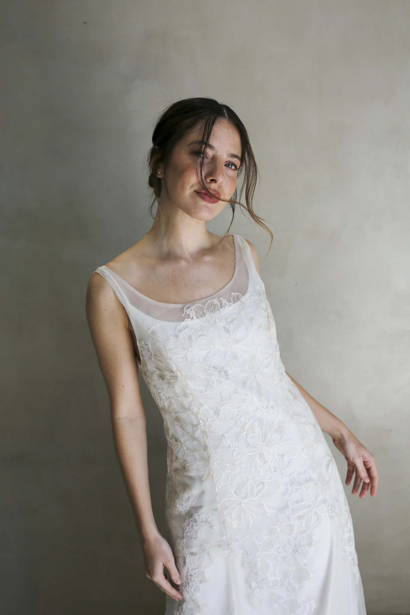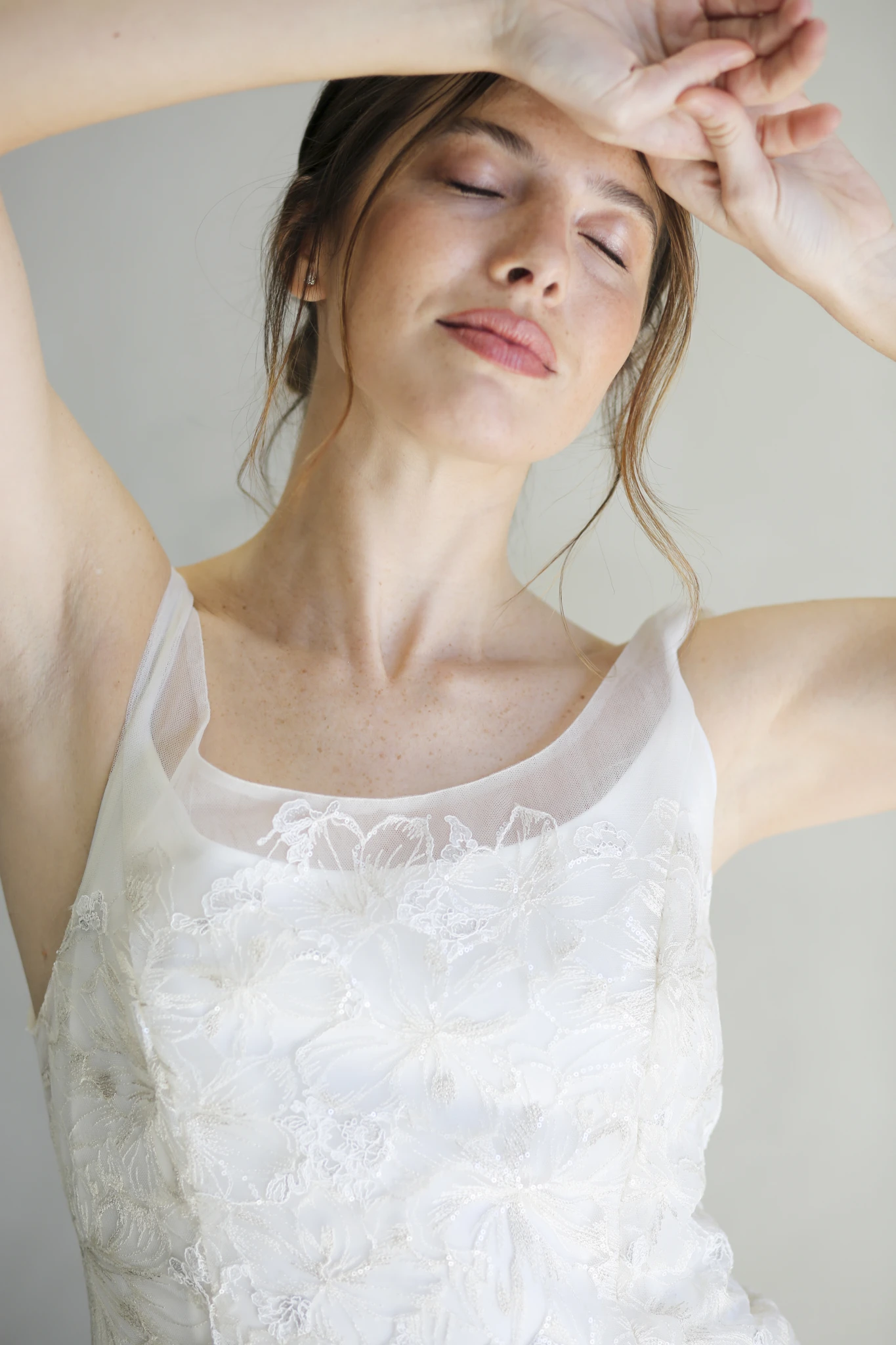 Confeccionado a mano con un delicado bordado de flores en hilo en tonosnaturales con detalles plata y dorado opaco, se complementa con un escote redondeado de tul translúcido que suaviza y enmarca el diseño con sutileza.